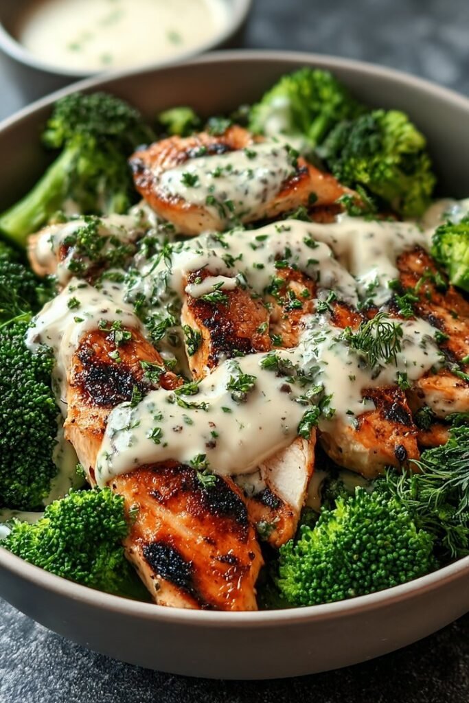 Grilled Chicken & Broccoli Bowls with Creamy Garlic Sauce