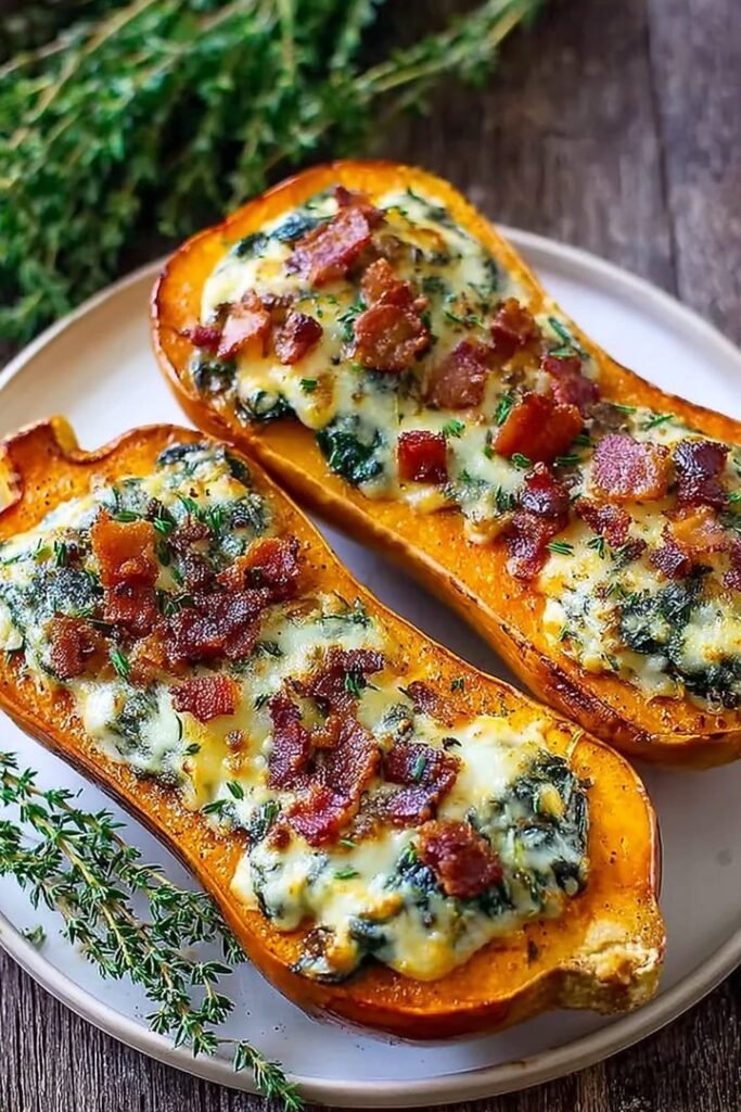 Irresistible Stuffed Butternut Squash with Spinach, Turkey Bacon, and Cheese – Alrightwithme