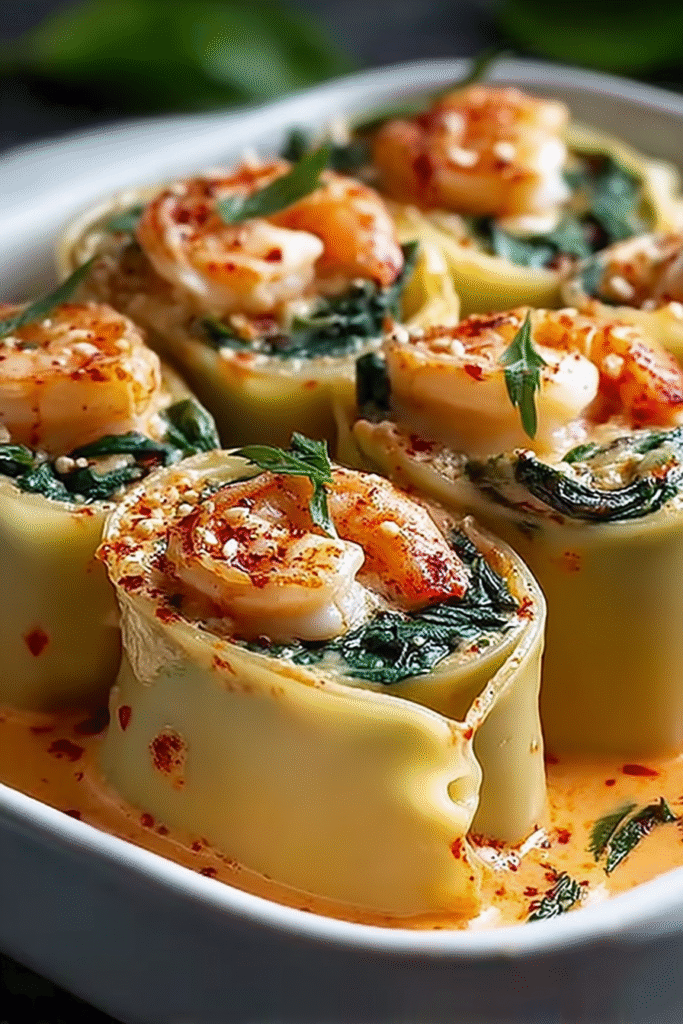 Shrimp and Spinach Stuffed Pasta Rolls with Roasted Red Pepper Cream: An Incredible 7-Step Recipe