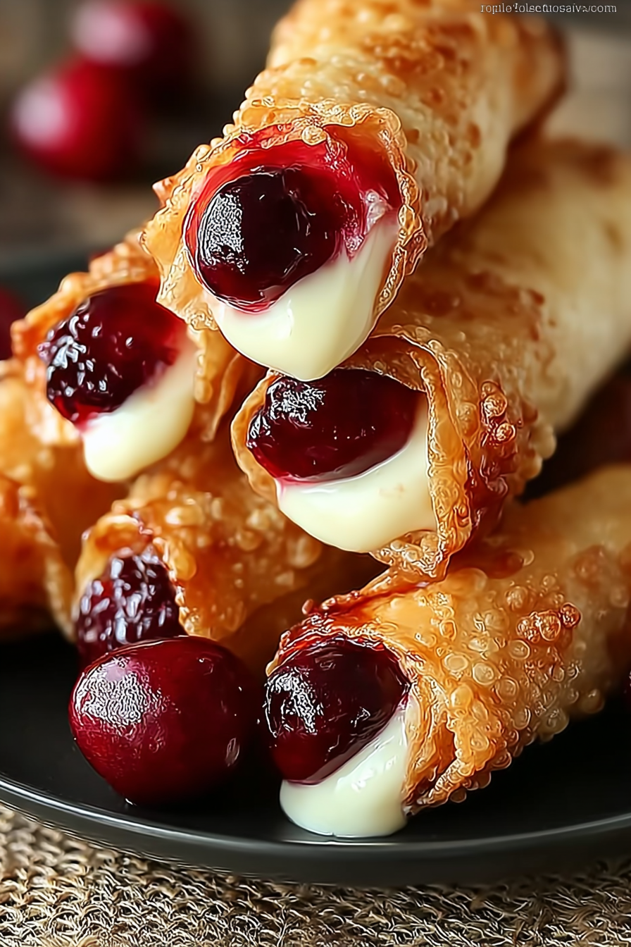 - With their golden-brown, crispy exterior and vibrant red cherry filling, these egg rolls are a visual treat, making them a show-stopping dessert for any occasion.