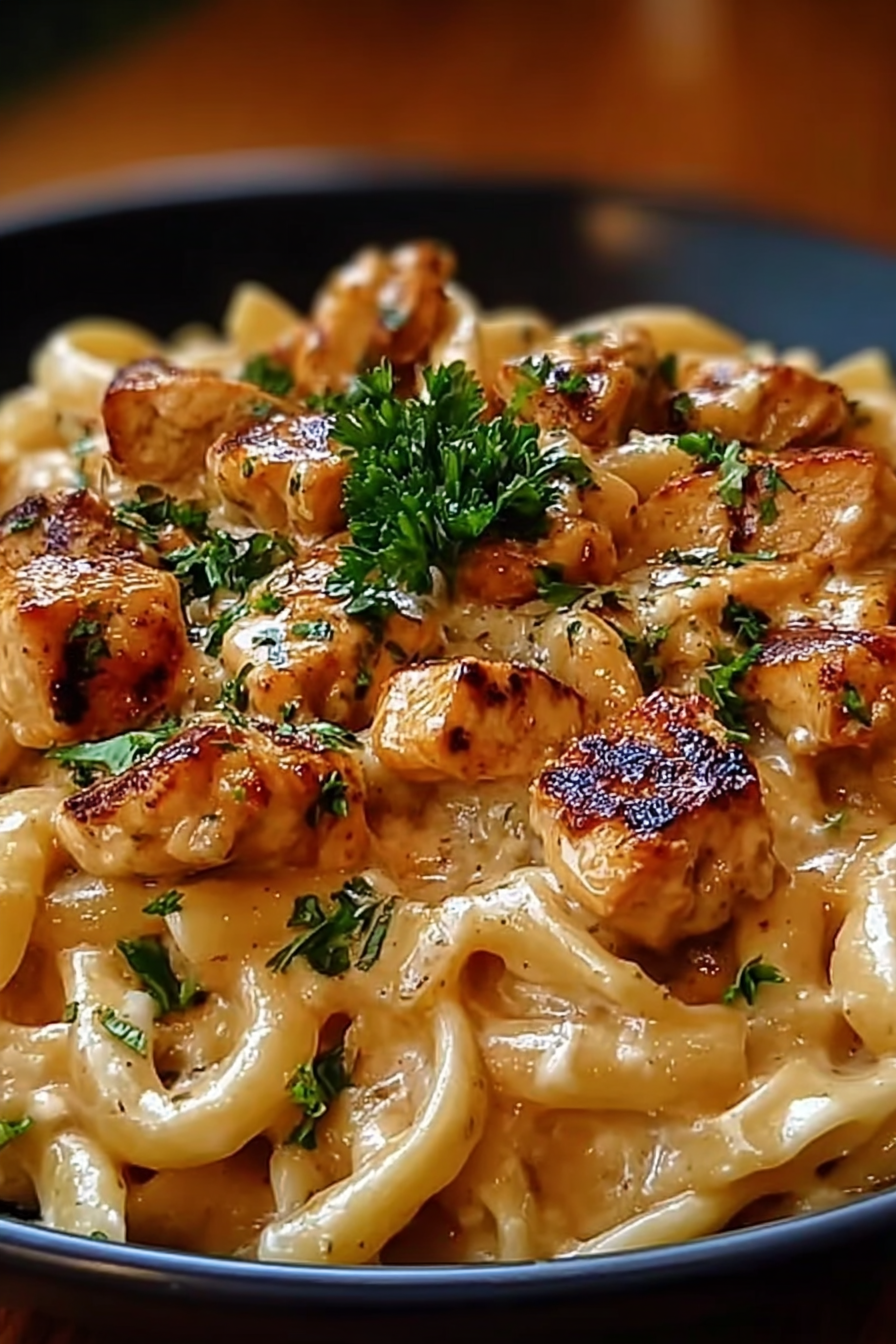 - Visually stunning, the creamy pasta, golden-brown chicken, and vibrant herbs create an appealing and appetizing dish.