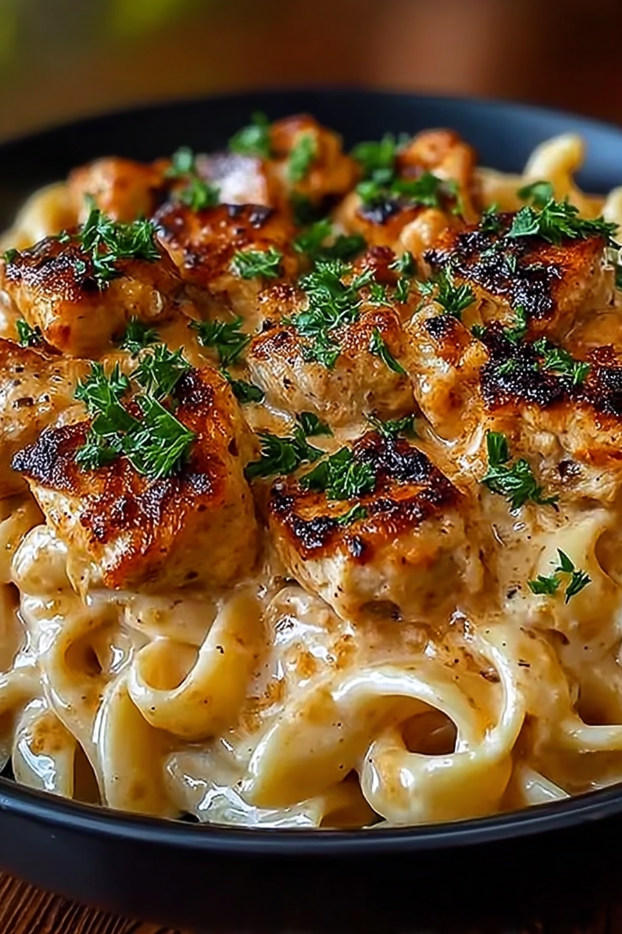 Add the cooked chicken to the sauce and gently toss to coat it evenly. Then, add the cooked pasta and toss everything together until it’s well combined. The final step is to gently toss to ensure all the pasta is coated with that amazing sauce. Serve immediately. Garnish with fresh parsley, and don’t forget to add a hearty helping of love!