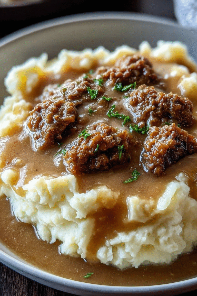Spoon a generous serving of mashed potatoes onto a plate. Ladle the chicken hamburger gravy over the top. Garnish with a sprinkle of fresh parsley, if desired. Enjoy your delicious chicken hamburger gravy over mashed potatoes!