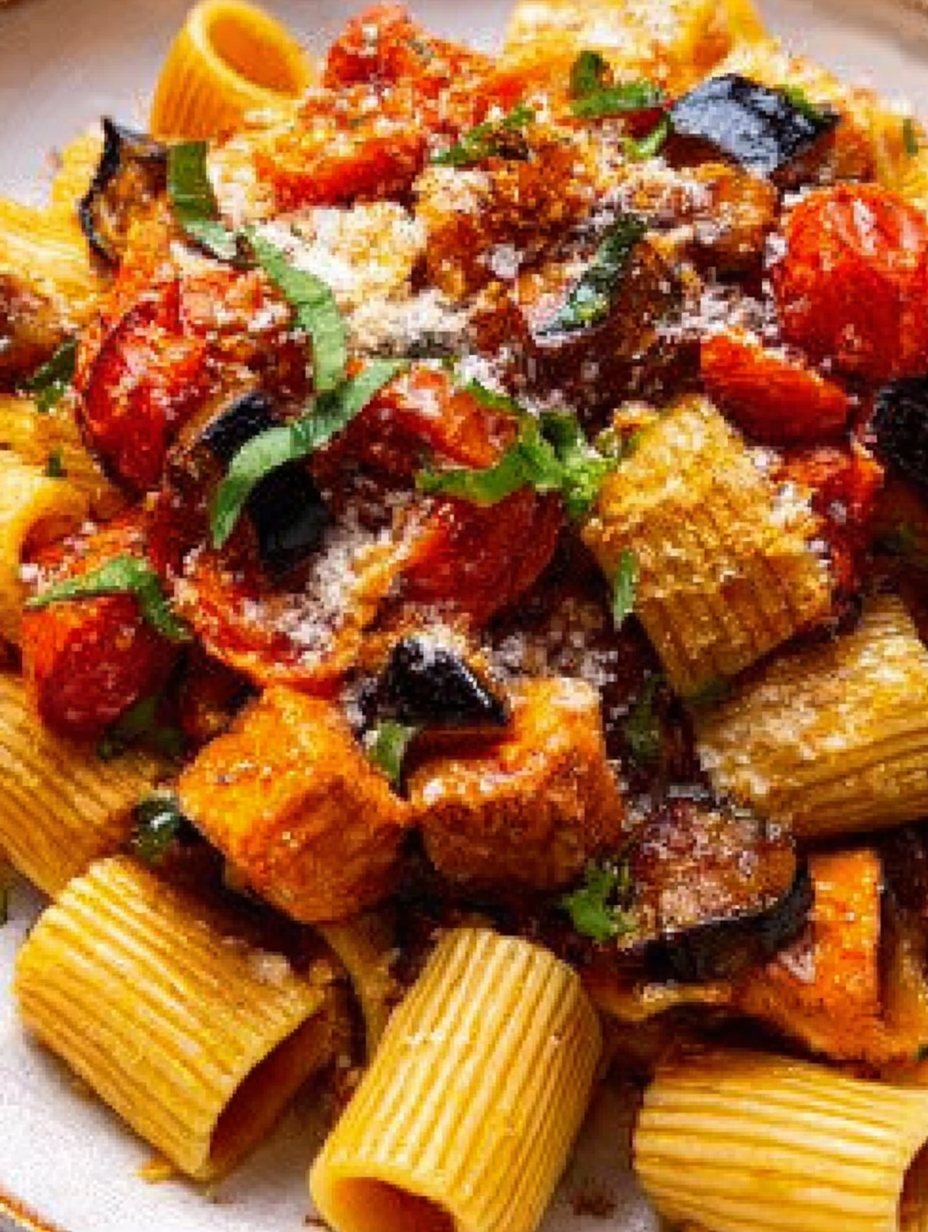 Ah, the scent of ripe tomatoes simmering with garlic, mingling with the earthy aroma of roasted eggplant—it’s a symphony of summer on a plate! Imagine twirling strands of perfectly cooked pasta, each bite bursting with sweet and savory goodness.