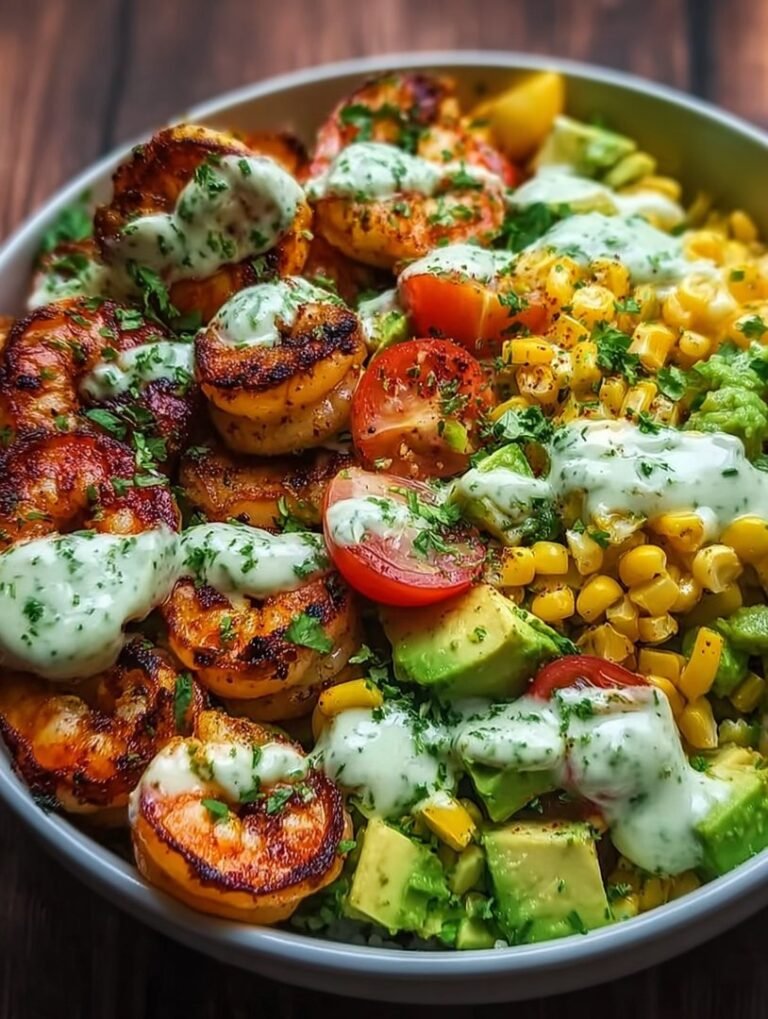 The Ultimate Grilled Shrimp Bowl with Avocado, Corn Salsa & Creamy Garlic Sauce: An Incredible Recipe