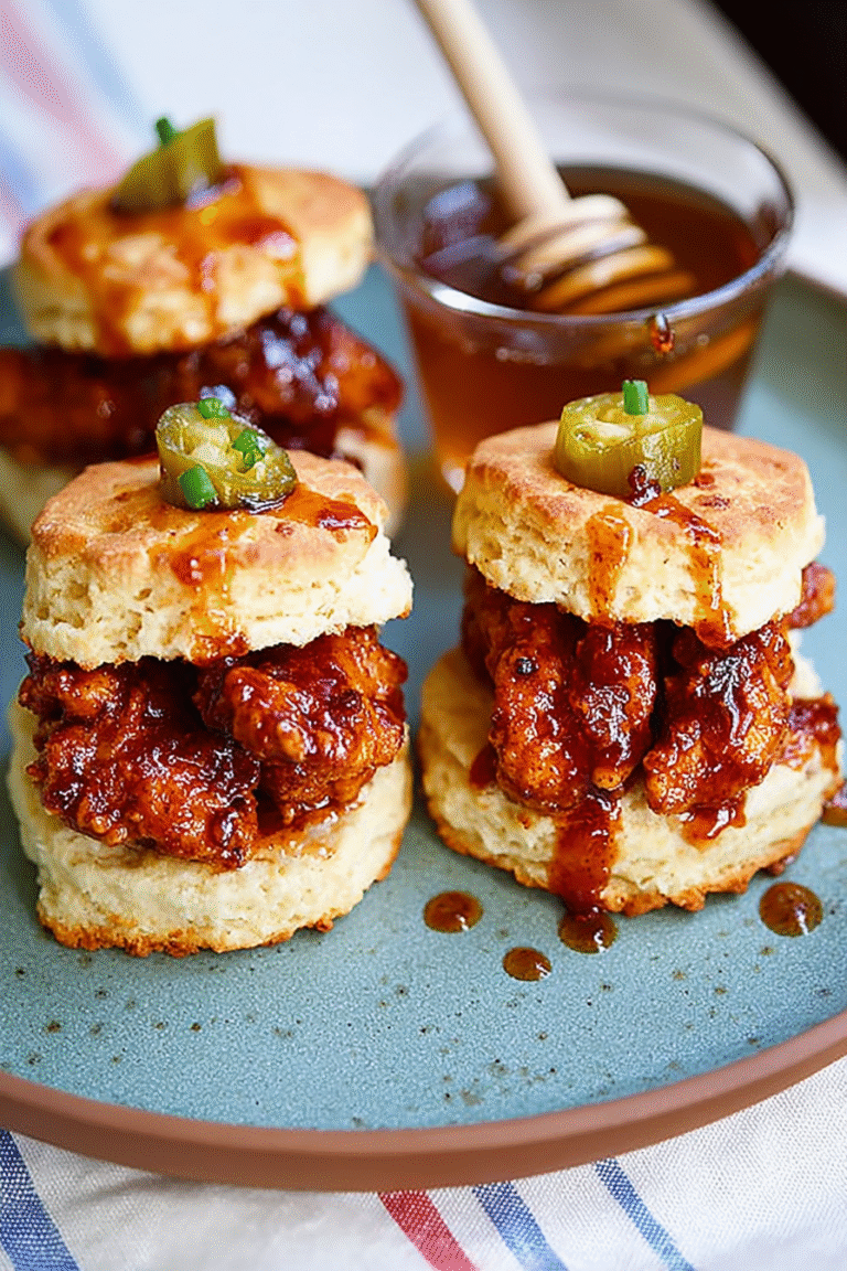 To handle leftovers, store the components separately. Keep the fried chicken in an airtight container in the refrigerator for up to three days. The biscuits can be stored at room temperature or refrigerated. Reheat the chicken in an air fryer or a hot oven to restore its amazing crispness; microwaving is strictly forbidden unless you enjoy rubbery poultry. Reheat the hot honey sauce gently on the stove. Assemble the individual chicken biscuits right before serving to keep the integrity of the texture intact. This incredible recipe guarantees a happy crowd and eliminates the need for any other side dish, although a simple vinegar based coleslaw makes a fantastic accompaniment.