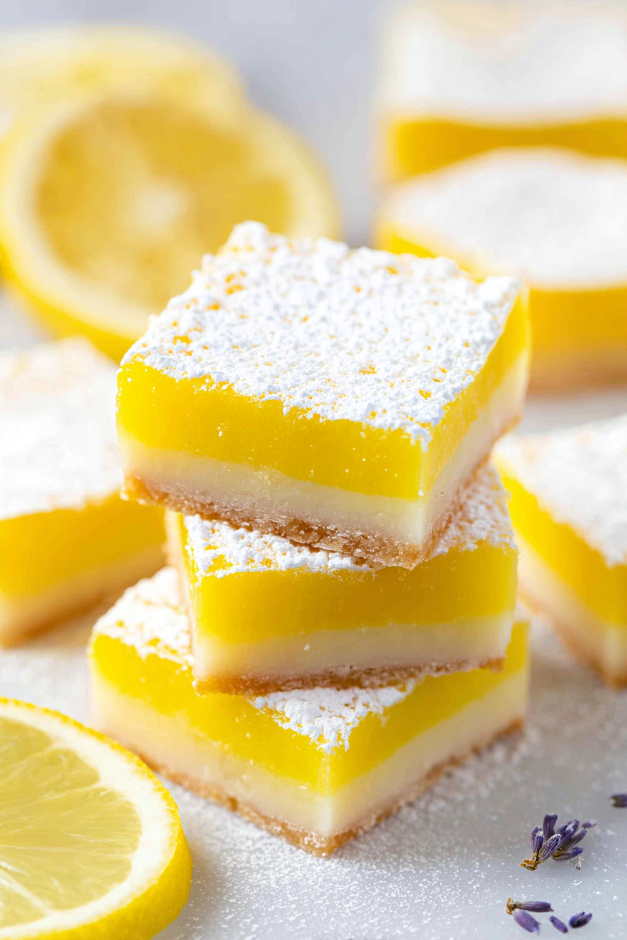 Once the bars are thoroughly chilled, carefully lift them out of the pan using the parchment paper overhang. Dust with powdered sugar, garnish with fresh lavender sprigs or lemon zest (optional), and cut into squares. Serve and enjoy the magic! These bars are best served chilled.