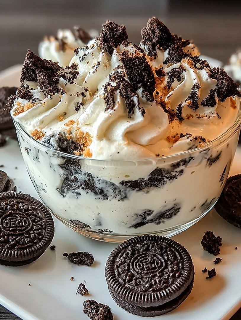 5. **Serve and Enjoy: ** Once chilled, scoop into bowls or glasses and garnish with extra crushed Oreos, mini chocolate chips, or whatever your heart desires. Prepare for the compliments to roll in.