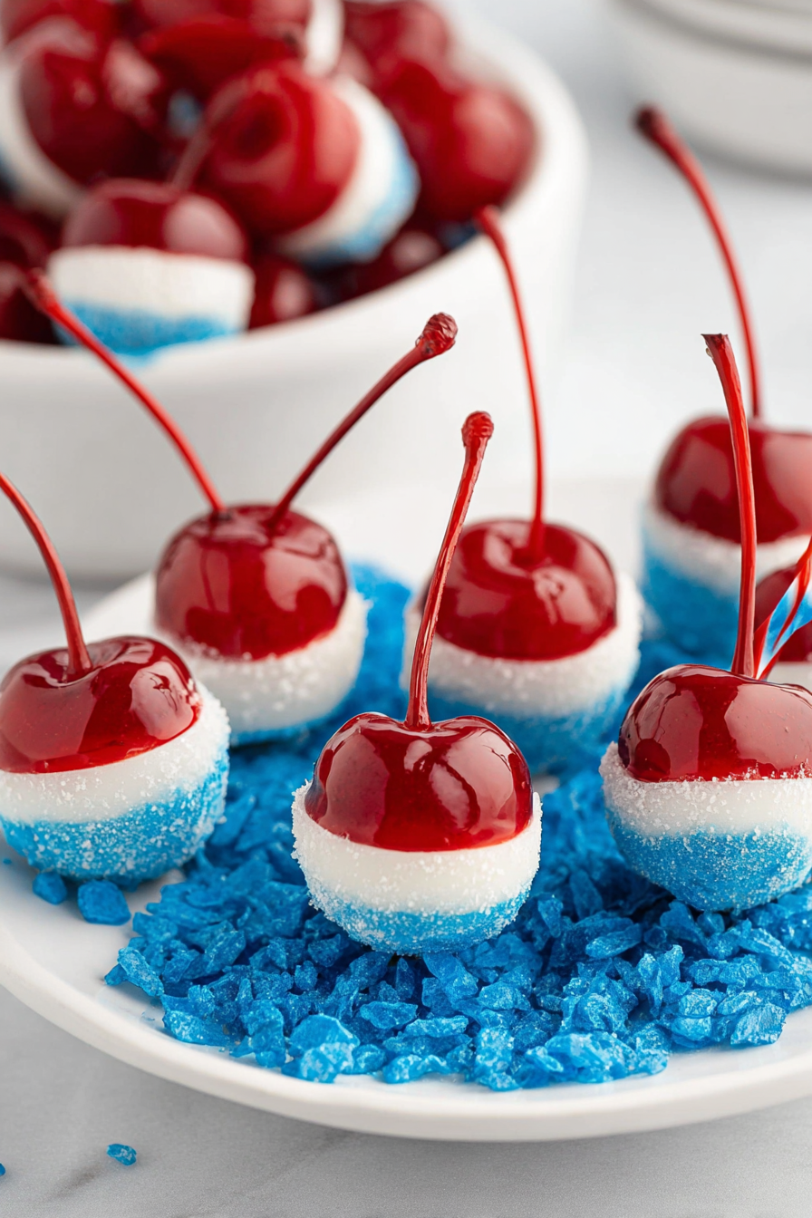 - Step 5: Once the white and dark chocolate has slightly set, use a toothpick or small spoon to drizzle red and blue candy melts over the cherries in a festive design. Immediately sprinkle with red, white, and blue sprinkles.