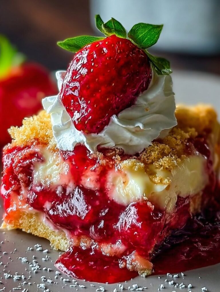 If, by some miracle, you have leftovers ofThe Ultimate Strawberry Cheesecake Dump Cake, storing them is straightforward. Allow the cake to cool completely, then cover the baking dish tightly with plastic wrap or aluminum foil. It will keep well in the refrigerator for up to four days. The texture remains excellent when chilled, making it a wonderful cold dessert as well. To reheat, you can place individual slices in the microwave for 30–45 seconds, or reheat the entire dish in a 300°F (150°C) oven for about 15 minutes, which helps revive that crispy topping. Avoid overheating, as this can make the fruit filling dry out.